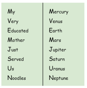 - Make up a mnemonic, a nonsense sentence using the first letters of a list you have to remember, like the order of operations in maths or the names of the planets.