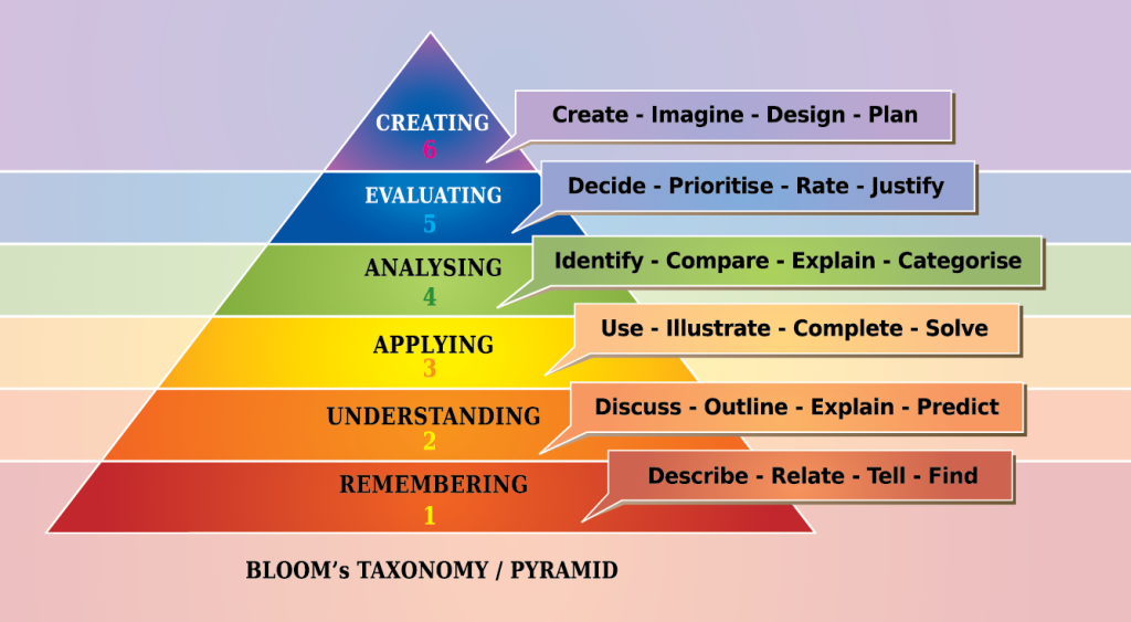 - The sixth and final level is creation. This is when you design a new solution to an “old” problem, write a persuasive essay that draws on different sources, or write a poem on a given theme.