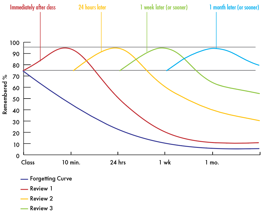Cramming the material once may get you through a test, but if that’s all you do, you will have to start from scratch when you get to the exam. That is not an efficient use of your total study time. If you apply spaced repetition, you will spend less time in total on the material to get to the same level of understanding and retention. Research about the “forgetting curve” illustrates this very clearly.